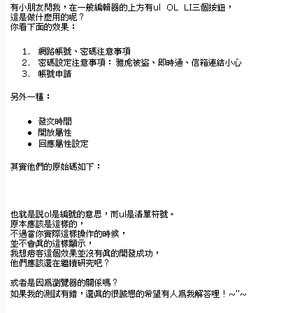 有小朋友問我,在一般編輯器的上方有ul OL LI三個按鈕,這是做什麼用的呢?